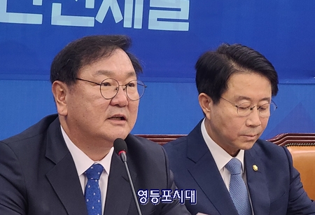 민주당 김태년 원내대표(사진 왼쪽)은 26일 오전 국회에서 원내 대책 회의를 열고 모두 발언을 통해 “코로나19는 경제‧산업구조의 급속한 변화를 가져오고 있다”고 지적하고 “평시의 재정전략으로는 당면한 위기를 극복할 수도, 또 전방위적 개혁도 추진할 수도 없다”고 강조했다.
