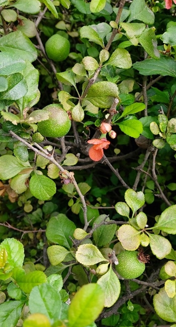 여자들이 바람날까 집안에 심지 못하게 했다는 서러운 사연 하나쯤 갖고 있을 듯한 명자나무, 그 꽃 떨군 자리에 모과 같기도 한 향기 그윽한 열매, 장미과이니 넝쿨이다.