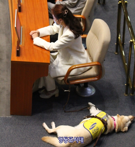 미래통합당 소속 시각장애 김예지 국회의원은 안내견 조이와 함께 본회장에 입장해 관심을 모았다. 김예지 의원은 헌정사상 첫 여성 시각장애 국회의원이다.