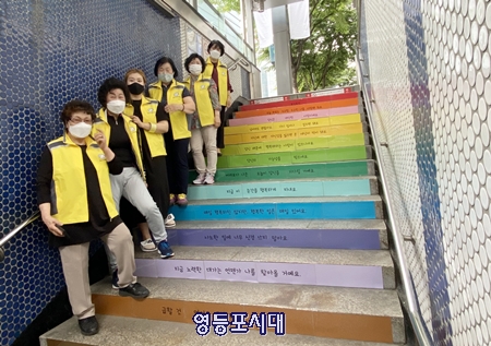 영등포구 자원봉사센터 아파트봉사단 단장 일동은 6월 4일 출퇴근길 유동 인구가 많은 영등포구청 4번 출구에 코로나19 극복을 위한 응원 문구를 부착했다. 칙칙했던 계단에 알록달록한 색지를 붙이고 응원 문구를 삽입하여 희망 계단을 만들어 코로나19의 장기화로 우울해지는 요즘 시민들에게 정서적 안정을 선물해 눈길을 끌었다. 색지에는 “지금, 이 순간 행복하게 지내요”, “당신의 가능성을 믿으세요”, “넘어져도 괜찮아요. 다시 일어나 걸으면 돼요” 등의 응원 문구가 적혀있다. 영등포구 자원봉사센터 관계자는 6월 5일 저녁 본지와의 통화에서 “코로나19로 인해 심신이 지쳐가는 시점에서 직원의 아이디어로 시작한 일이다”며 함께 봉사에 나서준 아파트봉사단 단장님께 감사의 인사를 전했다.