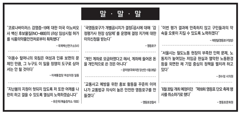 -국제백신연구소(IVI) “이용수 할머니의 외침은 여성과 인류 보편의 문제인 만큼, 그 누구도 이 일을 정쟁의 도구로 삼아서는 안 될 것이다” -미래통합당 여성의원 일동 “지난봄의 지원이 헛되지 않도록 저 또한 어깨를 나란히 하고 걸을 수 있도록 열심히 노력하겠습니다” -유은옥(예술창작소 대표) “개인 계좌로 모금하였다고 해서, 계좌에 들어온 돈을 개인적으로 쓴 것은 아니다” 윤미향(국회의원 당선인-5월 29일) “유흥주점 다 죽이는 무기한 강제휴업, 즉각 중단하라” -유흥음식점 중앙회 지회장 등 관계자 “영등포구가 개별공시지가 결정∙공시에 대해 ‘감정평가사 현장 상담제’를 운영해 결정 지가에 대한 이의신청을 받는다” -영등포구 “교통사고 예방을 위한 홍보 활동을 꾸준히 이어나가 교통법규 의식이 높은 안전한 영등포구를 만들겠다” -영등포경찰서 “이번 평가 결과에 만족하지 않고 구민들과의 약속을 오롯이 지킬 수 있도록 노력하겠다” -채현일(영등포구청장) “6월 20일 개최 예정이던 “제18회 영등포 단오 축제 행사를 취소하기로 했다” -영등포문화원 “청렴 스티커는 청 직원이 함께 붙였다. 화훼업체도 돕고 직원들 간의 소통과 청렴 의지를 다지는 느낌을 받았다” -남부교육지원청 관계자 “서울시는 철도노동 현장의 부족한 인력 문제, 노동자가 놓여있는 저임금 현실과 열악한 노동환경 등을 외면한 채 기업 중심의 정책을 펼치려 하고 있다” -권수정 시의원 “여러 정황을 살펴볼 때 이번 서울 청년센터 영등포 수탁 조합 선정 과정에 납득하기 어려운 부분이 너무 많다” A기관 관계자