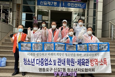 영등포구 신길7동 청소년지도협의회(회장 김인기)는 10일(수) 지역 내 청소년 다중업소 PC방ㆍ학원ㆍ태권도장등 주변과 현관입구ㆍ손잡이 등 방역과 소독을 시행했다.