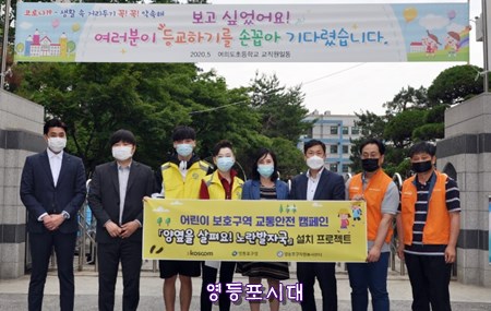 한국무선 가족봉사단 6명과 영등포구청, 영등포구자원봉사센터, 영등포구청, 코스콤(koscom) 관계자들은 12일 서울 영등포구 여의도초·중·여의도여고·여의도고·윤중초·중학교 앞에 “양옆을 살펴요”와 ‘노란발자국’스티커를 부착하는 봉사활동을 진행했다. 손녀딸과 함께 봉사활동을 지켜본 한 어르신(이는 아파트 거주)은 “고맙다”는 짧은 인사를 전했다. “양옆을 살펴요! 노란 발자국” 프로젝트는 횡단보도를 건너기 전 양옆을 살피도록 안내해 보행 사고를 예방하기 위해 횡단보도, 스쿨존 등에 설치하고 있다.