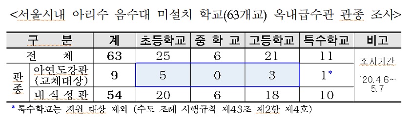 학교 내 취약한 음용 사각지대 해소를 위하여 ‘학교 내 녹에 취약한 급수관 교체 지원 시범사업’을 공동으로 추진한다. 최근 붉은 수돗물 사건으로 인하여 깨끗한 수돗물에 대한 사회적 관심이 증가한 가운데 교육청과 상수도 사업본부는 지난 6월 11일(목) 양해각서를 체결하고 학교 내 취약한 음용 사각지대 해소를 위해 발 벗고 나선다. 학교 아리수 음수대는 상수도 사업본부에서 2006년부터 설치하기 시작하여, 2020년 5월 기준 서울시 내 학교 95.4%(1,362개교 중 1,299개교 설치)에 설치되어 있다. 음수대 미설치 학교 63개교는 학부모의 반대 등으로 더 이상 사업 추진이 곤란하며, 그중 녹에 취약한 비내식성관 (아연도강관)으로 음용하고 있는 학교는 8개교로 노후급수관 교체가 필요한 상황이다.