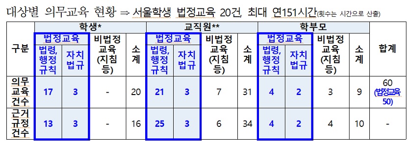 또한, 코로나 이후 예상되는 수업의 변화에 현장의 교원들이 적응해 나갈 수 있도록 교원연수를 비롯한 실질적인 지원방안에 대하여 주문했다. 조희연 교육감은 사회가 다원화되고 학교에 바라는 요구들도 다양해지면서 전에는 없던 많은 갈등과 어려움이 발생하고 있다고 지적하면서 학교와 지역사회의 협력을 확대해 나가야 할 뿐만 아니라 이를 지원하기 위하여 서울시민을 대표하는 의회와 서울시교육청의 긴밀한 소통도 중요하다고 강조했다. 또한, 코로나19가 장기화되거나 코로나19가 종식된 이후에도 유사한 재난상황이 발생할 경우를 대비하여 ‘코로나19 등 재난상황에서의 교육과정 특별법 제정’ 등 포스트 코로나 시대 대비 ‘서울교육 발전을 위한 15가지 제안’을 발표했다. 코로나19 확산에 따른 국가적인 재난으로 각급학교의 정상적인 등교수업(온라인 수업 병행) 및 교육과정 운영이 불가능하며, 향후 신종 바이러스 확산 등 각종 재난이 예측되는 상황이다. 이에 따라 학교현장에서 학생의 안전을 최우선으로 본질적인 정규교육과정에 집중하고, 교직원 및 학부모의 부담을 최소화할 수 있는 대안이 지속적으로 요구되고 있지만 문제는 이러한 상 각종 법령에서 규정하고 있는 의무교육으로 인하여 학교현장의 부담이 가중되고 있다는 점이다. 제안의 핵심은 ①안전교육 7대 영역, 아동학대예방 등 20건에 이르는 학생 의무교육 ②청렴교육, 공무원행동강령 등 24건에 이르는 교직원 의무교육 그리고 ③교육활동침해예방, 선행교육 및 선행학습유발행위 근절 등 6건에 이르는 학부모 의무교육 포함 50건에 이르는 유·초·중·고 정규교육과정 외 의무교육에 대하여 △교육 횟수 또는 시간의 전부 또는 일부를 면제하고 △집합교육의 전부 또는 일부를 인터넷 강의 등의 방법으로 대체하며 △이를 위해 교육부장관이 교육의 면제와 교육방법에 대한 기준을 결정하고 △앞으로 의무교육을 법령 제정 또는 개정할 때에는 교육영향평가를 실시하자는 내용이다. 이 밖에도 ▲서울형혁신교육지구 운영 ▲AI 교육 학교 내‧외 미래형 교육공간 구축 ▲명예퇴직수당 환수 법률 신설 및 개정 ▲쉼이 있는 교육환경 조성을 위한 학원 일요휴무제 추진 △선거교육을 위한 법적‧제도적 지원 ▲공존과 상생의 다문화교육 특별법 제정 ▲특수학교 건강관리지원을 위한 학교보건법 개정 ▲무상급식비 국가 재원 분담 조정 요청 ▲국유재산 점유 공립학교 사용허가 근거 마련 위한 법 개정 △학교용지 확보 등에 관한 특례법 개정 ▲사립학교 공공성 강화를 위한 법령 개정 ▲사립학교 교원 신규채용 사전협의 ▲사립학교 신규교원 교육청 위탁채용 확대 ▲사립학교 교원 연수 체계 구축 등이 제안됐다.