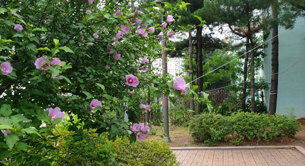 무궁화 활짝 피었다 무궁화(無窮花), 엄숙하여 저만치 있는 꽃이다 지금부터 찬바람 올 때까지 핀다. 본동사무소 앞 공원 초입에 무궁화동산이 있고 그곳은 아직이다. 근화(槿花)라고도 한다. 근(槿)의 새김이 무궁화다.