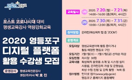 영등포구(구청장 채현일)는 코로나19의 장기화로 어려움을 겪고 있는 영등포구 지역 내 평생교육 강사들을 위한 비대면 디지털 플랫폼 활용 교육을 7월 20일~21일, 30일~31일 총 2회에 걸쳐 시행한다고 8일 오전 밝혔다. 코로나 이후 시대를 대비해 강의 프로그램의 질적 향상도 도모해 공백 없는 교육인프라 확보로 구민의 평생 학습권을 보장하기 위해서다. 이번 과정은 화상회의 앱을 통한 온라인 실시간 방식으로 진행되며 수강생들이 개별적으로 받은 접속 링크를 통해 개인 노트북이나 스마트폰을 이용하여 수강할 수 있다. 주요 교육내용은 비대면 온라인 콘텐츠의 설치부터 활용, 온라인 강의 운영과 실습 등이며 평생교육 강사, 방과후 강사, 평생 학습매니저로 활동 중이거나 활동 예정인 영등포구민이라면 누구나 7월 17일까지 영등포구청 홈페이지를 통해 신청할 수 있으며 수강료는 무료다.