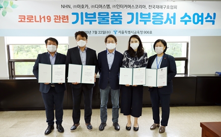 서울특별시교육청(교육감 조희연)은 22일(수) 오후 2시 코로나19 관련 물품을 기부한 5개 기업과 기관에 기부증서를 수여하는 합동 수여식을 개최했다.