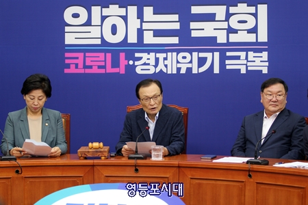 이해찬 대표(사진 가운데)는 “대선과 지방선거를 책임질 중요한 지도부를 뽑는 전당대회”임을 강조하고 “상대 후보에 대한 네거티브 없는 아름다운 경선”을 부탁했다. 이 대표는 “지난 주말에 기록적인 폭우로 부산 등 남부 지역에 피해가 있었다”며 “정부는 피해 복구에 총력 대응하는 한편 상습 침수 지역에 대한 대책 마련에도 힘써주시기를 바란다”고 당부했다. 이해찬 대표는 “지금 남북미 관계가 경색된 상황이다”고 지적하고 “이런 때일수록 대북정책의 공백이 최소화되도록 통일부 장관과 국정원장이 조속히 임명돼야 한다”는 점을 강조했다. 오늘(27일)부터 7월 국회의 상임위원회가 본격적으로 가동한다. 김태년 원내대표는 이와 관련 “일하는 국회법, 코로나 방역 강화 입법, 부동산 입법까지 국민을 위한 입법 과제가 줄줄이 기다리고 있다”며 “야당도 코로나 위기 극복과 국민의 삶을 챙기는 데 머리를 맞대고 최선을 다해 줄 것”을 당부했다. 김 원내대표는 “민주당은 7월 국회에서 국민의 주거 안정을 실현하기 위해 부동산 입법을 반드시 완수하겠다”며 “시장에 넘치는 유동성이 부동산 가격만 밀어 올리는 부작용을 막기 위해 생산적인 투자처를 만들어야 한다”고 강조했다. 김태년 원내대표는 “7월 국회에서 다주택자와 법인에 대한 종부세, 양도세 등을 강화하는 세법과 임대차 3법 처리를 최우선 민생 과제로 추진하겠다”고 밝히고 “미래통합당 등 야당도 7월 국회에서 국민의 주거 안정을 위한 부동산 법안이 반드시 처리될 수 있도록 협력해주시기를 당부드린다”며 야당의 협조를 촉구했다.