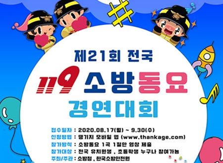 영등포소방서는 8월 17일부터 9월 30일까지 유치원생과 초등학생을 대상으로 119 소방동요 경연대회 참가팀을 모집한다고 28일 밝혔다. 코로나19 감염방지를 위해 온라인 영상 업로드 방식으로 변경한 이번 대회 참가 방법은 한국119 소년단 누리집의 119 자료실에 있는 소방동요 제1집부터 제7집까지 152곡 중 한 곡을 선택해 1절만 부르는 영상을 촬영, 땡기지 모바일 앱에 개별 접수하면 된다. 참여자에게는 신청한 접수 영상에 대해, 랜덤 방식을 통해 무작위 250명을 추첨해 4만원 상당의 문화상품권을 제공한다.