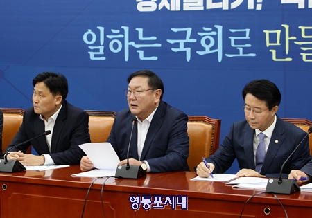 김 원내대표는 이날 모두 발언에서 “국회 차원에서 조속한 피해 수습을 위한 예비비 투입 등 가능한 방안을 모두 강구 하겠다”며 재단 당국에 “이재민과 실종자가 늘어나고 있는데 피해지역의 응급복구와 재난 구호 조치 및 추가피해가 없도록 최선을 다해 줄 것”을 요청했다. 조정식 정책위의장(사진 오른쪽)는 4일(화) 마무리한 7월 임시국회와 관련 “21대 국회가 일하는 국회, 구체적 민생성과를 도출하는 국회로 나아갈 수 있을 것인지 여부를 판별할 중요한 시험대였다”고 평가하고 “미래통합당은 색깔론과 국정 발목잡기에만 매달렸다”며 미래통합당을 비판했다. 조 정책위의장은 이어 “이번에 발표된 8•4 공급대책으로 서울권에 약 26만 호의 주택이 공급될 예정인데 수도권 신규 주택 부족 해소에 크게 기여할 것으로 기대한다”며 “새롭게 도입된 ‘공공참여형 고밀도 재건축’ 사업 정착에 박차를 가하겠다”고 강조했다. 조정식 정책위의장은 내일(7일)로 예정된 의료계의 집단휴진 움직임에 대해 “단적으로 경북과 충남의 경우 인구 천 명 당 의사 숫자가 서울의 절반에도 미치지 못하고 있다”고 지적하고 “이 때문에 보건의료 단체들과 전문가들을 중심으로 의료 인력 충원 문제가 지속적해서 제기되어 왔고 이에 더불어민주당은 지난 총선 당시 의대 정원 증원을 국민에게 약속드렸고 이를 추진하게 된 것이다”고 밝혔다. 조 정책위의장은 “의대 정원 증원은 국민 안전 강화를 위한 필수적 전제조건이다”고 잘라 말하고 “필요한 곳에 필요한 만큼의 의사를 확보하기 위한 대책을 마련하는 것은 선택의 문제도 피할 수 있는 문제도 아니다”면서도 “당정은 의료계가 우려하는 부분들에 대해서도 귀를 기울이겠다”고 밝혔다.