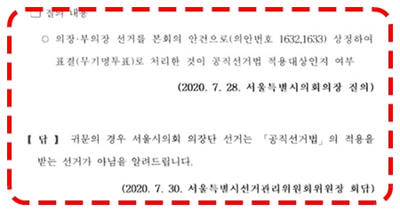 서울시의회 민주당은 “서울시의회 의장단 선거가 끝난 한 달여가 지난 시점에 뒤늦게 일부 언론을 통해 서울시의회 의장단 선거 과정이 마치 불법·부정에 의한 선거로 비치고 있는 것에 대한 사실관계를 명백히 밝히고 불필요한 오해가 확산하지 않도록 하겠다”며 이같이 밝혔다. 서울시의회 민주당은 “해당 선거가 공직선거법 위반을 이유로 불법·부정한 선거라는 일부 언론의 자극적이고 선동적인 주장에 대해 명백히 사실이 아니다”고 밝히고 서울특별시 선거관리위원회 위원장 명의의 질의회신문 공문을 공개했다. 공문에 따르면 서울시의회 의장단 선거는 ‘공직선거법’의 적용을 받는 선거가 아니다. 또 무기명 투표 원칙 위반이라는 주장에 대해서도 “본회의 안건으로 상정된 서울시의회 의장단 선거는 지방자치법 48조 등 관련 근거에 따라 철저히 무기명 투표 원칙을 준수한 것이므로, 이에 대한 어떤 근거 없는 주장이 더는 확산하여서는 안 된다”고 밝혔다. 서울시의회 민주당은 일부 언론을 통해 소수당의 의사결정 권한을 침해한 것이라는 주장에 대해서도 “일방적인 정치적 공세에 불과하고, 해당 선거가 진행되는 모든 과정이 평온하게 진행되었을 뿐만 아니라 소수정당의 의결권 행사에 아무런 유·무형의 장애 요소가 없었음”을 분명하게 밝혔다. 다만, “역대 서울시의회 의장단 선거 절차는 원 구성 과정의 하나로서 각 교섭단체의 합의에 의하여 진행해 온 것으로 이미 관례로 받아들여진 것이다”며 “그 과정에서 비교섭단체인 소수당에 대해서도 후보와 본회의 절차에 대해 사전 설명하는 등 배려가 있었다”고 밝혔다. 끝으로 “당내 경선 전 과정을 인터넷 생중계하는 등 투명하고 공정하게 이루어져 왔음”을 강조하고 “정작 6월 25일 본회의 안건처리 과정에서 동료 의원이 기표소 내부를 무단으로 촬영하여 법적 근거 제시를 하지 않으면서 마치 서울시의회 의장단 선거가 마치 무효인 것처럼 주장하는 것은 동료 서울시 의원뿐만 아니라 소속 공무원을 비롯한 구성원 전체의 신뢰를 훼손하는 것이다”고 강조했다. 조상호 대표의원은 “본회의 안건으로 처리되는 지방의회 의장단 선거에 대하여 의장단 후보자 등록과 선출과정에 대한 세부 규정이 없는 점에서 비롯된 오해라고 보고 제기된 문제들을 구체적으로 검토하여 개선방안을 찾아볼 것이라고”밝혔다.