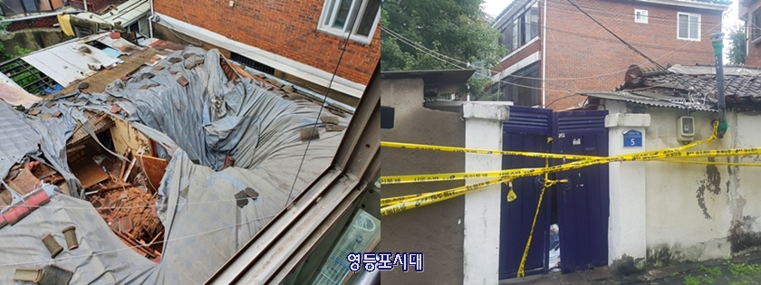 11일 오전 영등포구 신길로62가길 5 소재 주택의 지붕이 내려앉았다. 멈추지 않고 연일 쏟아지는 폭우를 견디지 못해 붕괴한 주택 입구는 현재 봉쇄되어 있다. 이 주택은 60년 이상 된 노후주택이다.