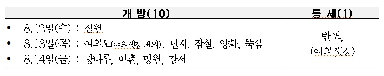 이로써, 14일(금) 오전 10시를 기점으로 전체 11개 한강공원 중 10개소 출입이 가능해지며, 장기간 침수되었던 반포한강공원과 여의도한강공원의 일부인 여의 샛강생태공원은 통제 및 복구 작업을 지속한다.