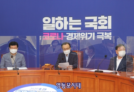 이해찬 대표(사진 가운데)는 “사랑제일교회 등과 광화문 집회에서 시작된 코로나 감염이 수도권을 넘어서 전국으로 일주일 만에 확산하고 있다. 속도가 매우 빠르다”며 이같이 강조했다. 이해찬 대표는 “방역 당국과 지자체는 신속한 전수검사로 확산을 차단해야 할 것이다”며 “신도들과 집회 참석자들은 본인과 가족, 주변을 위해 검사에 협조해주시기 바란다”고 촉구했다. 이 대표는 “신분보장에도 불구하고 검사에 불응한다면 정부는 전원 고발과 구상권 행사도 불사할 것임을 강력히 경고한다”고 밝혔다. 이해찬 대표는 “행정명령을 어긴 단체와 개인에 불관용과 최대 처벌의 원칙으로 대응하도록 하겠다”고 경고하고 “상황에 따른 선제적 경제 대응도 지금부터 준비해야 한다”며 “취약계층과 피해가 큰 자영업 등 이번 상황이 길어지면 견디기가 매우 어려울 것으로 판단된다”는 우려를 나타냈다. 김태년 원내대표는 “코로나 2차 대확산이 중대 고비를 맞고 있다”며 “민주당과 정부는 무한 책임을 가지고 최대한의 비상 방역조치를 취하겠다”고 밝혔다. 김 원내대표는 “진단검사, 생활치료센터 확충, 중환자실 병상확보, 특히 지자체 간 협력 등 최고 수준의 방역대응태세에 돌입하겠다”며 이같이 밝혔다. 김태년 원내대표는 “사회적 거리두기 강화에 따른 자영업자와 소상공인의 경제적 피해를 최소화하기 위한 민생대책 마련에도 최선을 다하겠다”며 “모든 국민이 참여해야 한다. 나로부터 솔선수범이 전국으로 확산할 때 코로나 2차 방역에서 우리는 다시 승리할 수 있다”고 강조했다. 김 원내대표는 “기업과 소상공인, 자영업자 등에게 과감한 유동성 지원을 강화하겠다”며 “내 가족과 이웃, 국민 모두의 생명과 안전을 지키기 위해 마스크 쓰기, 외출 삼가기, 모임 자제하기 등 정부의 방역수칙 지키기에 모든 국민이 참여해야 한다”고 호소했다. 김태년 원내대표는 “미래통합당도 국론분열 조장을 중단하고 방역에 적극적으로 협력해주길 바란다”고 호소하고 “미래통합당이 방역에 협조할 의지가 있다면 광화문 집회 참가자에게 지금이라도 진단검사를 받을 것을 강력히 권고해주어야 한다”며 미래통합당의 협조를 촉구했다.