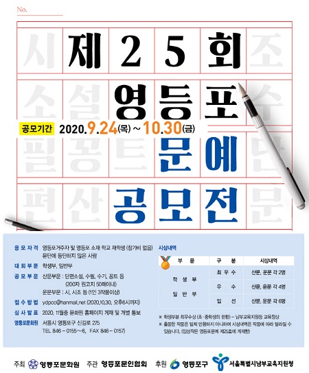 영등포문화원은 9월 24일(목)부터 10월 30일(금)까지 제25회 영등포 문예 공모전을 개최한다. 37일간 진행되는 이번 공모전은 학생과 일반부로 산문(단편소설, 수필, 수기, 콩트 등) 부분과 운문(시, 시조 등) 부분으로 나누어 진행되며 영등포 거주자와 영등포에 있는 학교 재학생은 누구나 응모할 수 있다. 다만 문단에 등단하지 않은 사람이어야 한다. 산문 부분은 200자 원고지 50매 이내로 응모할 수 있으며 운문 부분은 1인 세 작품 이상 응모할수 있다. 응모는 영등포문화원 E-mail : ydpcc@hanmail.net으로 10월 30일 오후 6시까지 하면 된다. 시상은 학생부와 일반부 각각 최우수(산문, 운문, 각 2명), 우수(산문, 운문, 각 4명), 입선(산문, 운문 6명) 당선작을 선정한다. 학생 부분 최우수작은 (초, 중학생)은 남부교육지원청 교육장 상을 수여한다. 심사 발표는 11월 중 문화원 홈페이지에 게재와 함께 개별적으로 통보할 예정이다. 제25회 영등포 문예 공모전은 영등포문화원(원장 한천희, 사무국장 이용욱)이 주최하고 영등포 문인협회가 주관하며 영등포구와 서울시 남부교육지원청이 후원한다.