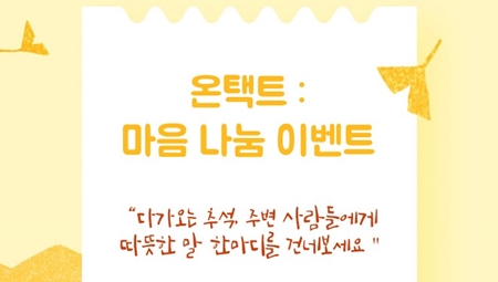 이에 서울시정신건강복지센터는 ‘온택트: 마음 나눔’ 이벤트를 통해 코로나19시대의 물리적, 시간적 제약으로 전하지 못했던 가족, 친지, 이웃에 대한 따뜻한 마음을 나누고 우리 모두가 위로와 응원의 시간을 가질 수 있도록 ‘온택트: 마음 나눔’ 이벤트를 진행한다. 서울시정신건강복지센터(이하 서울센터)가 14일부터 민족 고유의 명절 추석을 맞이하여 ‘온택트: 마음 나눔’ 이벤트를 진행하고 있다고 16일 밝혔다. 마음 나눔’ 이벤트는 코로나19 방역조치로 시작된 ‘사회적 거리두기’가 다가오는 추석 연휴에도 특별 방역 기간으로 계속 유지될 전망인 가운데, 코로나19로 대면으로는 전달하기 힘들었던 가족과 친지, 그리고 이웃에 대한 마음을 온택트(Ontact: 온라인을 통해 대면하는 방식)로 나누기 위해 진행되고 있다. 중앙재난안전대책본부(이하 중대본) 발표에 따라 연휴 기간이 포함된 이달 말부터 개천절, 한글날 공휴일이 포함된 2주간은 ‘특별 방역 기간’으로 지정됐고 명절 연휴에 가급적 이동을 자제하는 것이 권고되었다. 명절 연휴를 앞두고 있음에도 불구하고 최근 코로나19의 재확산과 그에 따른 방역 조치가 강화되면서 외부와 단절된 생활은 당분간 지속할 전망이다. 이번 행사는 21일(월)까지 ‘블루터치’ 페이스북 페이지에서 진행되며 페이스북 사용자라면 누구나 이벤트 참여가 가능하다. 이벤트 게시물을 확인 후 댓글로 남긴 응모자 중 추첨을 통해 선정된 당첨자에게는 ‘1만원 상당의 커피 기프티콘’을 증정한다. 당첨자는 25일(금) 블루터치 페이스북 이벤트 페이지에서 확인할 수 있다. 서울시정신건강복지센터 이해우 센터장은 “다가오는 추석 연휴에 서로의 물리적 거리는 잠시 멀어지더라도 마음만은 가까이 있음을 전하면서 건강한 명절을 보내시길 바란다”고 말했다.