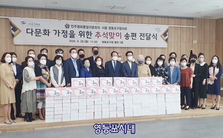민주평화통일자문회의 서울 영등포구협의회(회장 반풍록)는 28일 영등포구청 별관 5층에서 다문화 가정을 위한 추석을 맞이하여 송편을 전달했다. 이날 송편 전달식에는 고기판 영등포구의회 의장, 영등포구 출신 시/구의원, 다문화가정, 탈북민대표센터장, 민주평통 임원진 등 35명이 함께했다.
