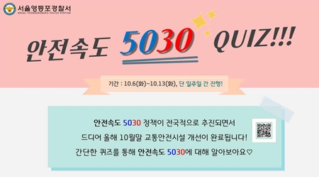 2021년 4월부터 본격 시행되는 ‘안전속도 5030’ 정책 홍보를 위해 ‘안전속도5030’ 퀴즈이벤트를 진행하고 있는 영등포경찰서(서장 오동근)가 ‘안전속도 5030’ 정책 대비를 위해 영등포구 내 도로시설 정비를 올해 10월 말까지 완료할 예정이다. 영등포경찰서는 10월6일(화)부터 시작한 ‘안전속도5030’ 퀴즈 이벤트‘를 10월13일(화)까지 진행한다고 10월 8일 밝혔다. 이번 퀴즈이벤트는 ‘안전속도5030‘라는 주제로 영등포구청 홈페이지, 맘카페(맘스러브), 영등포경찰서 교통과 인스타그램(@ydp_pol) 등에 게시되고 있다. 영등포경찰서는 “이벤트에 참여한 영등포구 시민 중 20명을 추첨해 차량용 공기청정기, 차량용무선충전거치대 등의 상품을 지급할 계획이며, 10월 14일(수) 각 게시된 홈페이지에 발표할 예정이다. 서울영등포경찰서 교통과는 “앞으로도 개선된 정책을 알리기 위해 다양한 홍보 대책을 추진해 나갈 계획이다”라고 덧붙였다.