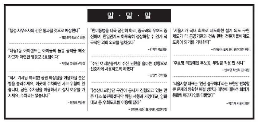 -영등포구의회 C 의원 “대림1동 아이랜드는 아이들의 돌봄 공백을 해소하고자 마련한 영등포 3호점이다” -채현일 영등포구청장 “택시 기사님 여러분! 공원 화장실을 이용하실 분은 벨을 눌러주세요. 이곳에 주차하면 사고 위험이 있습니다. 공원 주차장을 이용하시고 잠시 여유를 가지세요. 주차료는 없습니다” -영등포문화원 “한미동맹을 더욱 굳건히 하고, 중국과의 우호도 증진하며, 한일관계도 하루속히 정상화할 수 있게 적극적인 의회 외교를 펼치겠다” -김영주 국회의원 “주민 여러분들께서 주신 권한을 올바른 방향으로 신중하게 사용하도록 하겠다” -김민석 국회의원 “주호영 의원에겐 무노동, 무임금 적용 안 하냐” -민주당 최민희 전 의원 “FKII에서 근무하고 있어야 할 일과시간에도 KBS1-R‘오태훈의 시사본부’ 등 다수의 프로그램에 출연하고 있는 최민희 전 의원이야말로 무노동 유임금 전형 아닌가” -미래통합당 미미어국 “(국회)의장은 야당의 원내지도부 공백 등을 고려해 19일 본회의를 개의하지 않기로 했다. 국민의 국회로 나아가기 위해 양당 원내대표들은 하루빨리 합의해 달라” -한민수 국회 공보수석 “신정교 밑에서 담배를 피우고 꽁초를 마구 버리는데 ‘하천감시’라는 글이 적힌 조끼를 입은 사람들은 가만히 보고만 있다. 하천 감시단? 이 단체를 왜? 누가? 무엇을 위해 만들었는지 궁금하다.” -문종근(생활환경 지킴이) “(성산)남단 구간이 공사가 진행되고 있는 만큼 다소 불편하겠지만 차량 서행과 가양대교, 양화대교 등 우회도로를 이용해 달라” -한제현 서울시 도시기반시설본부장 “서울시가 국내 최초로 제도화한 설계 의도 구현제도가 타 공공기관과 건축 관련 전문가들에게도 도움이 되기를 기대한다” -김태형 서울시 도시 공간 개선 단장 “서울시향 대표는 “연신 송구하다”라는 표현만 반복할 뿐 문제의 명확한 해결 방안과 대책에 대해선 회의가 종료될 때까지 입을 다물었다“ -박기재 서울시의원 “작가들 사이에서는 이제 혹서기 결방에 이어 혹한기 결방까지 나오는 것 아니냐는 자조 섞인 말까지 나오고 있다” -전국언론노동조합 방송작가지부