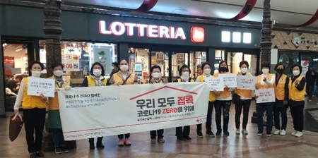 대한적십자사 희망 풍차 봉사원들은 21일 오전 영등포역 앞에서 코로나19 ZERO 캠페인을 시행했다.