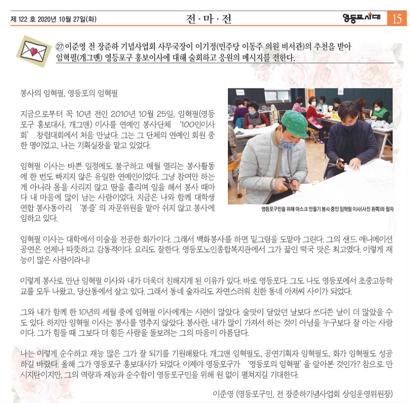 봉사의 임혁필, 영등포의 임혁필 지금으로부터 꼭 10년 전인 2010년 10월 25일, 임혁필(영등포구 홍보대사, 개그맨) 이사를 연예인 봉사단체 ‘100인이사회’ 창립대회에서 처음 만났다. 그는 그 단체의 연예인 회원 중 한 명이었고, 나는 기획실장을 맡고 있었다. 임혁필 이사는 바쁜 일정에도 불구하고 매월 열리는 봉사활동에 한 번도 빠지지 않은 유일한 연예인이었다. 그냥 참여만 하는 게 아니라 몸을 사리지 않고 땀을 흘리며 일을 해서 봉사 때마다 내 마음에 많이 남는 사람이었다. 지금은 나와 함께 대학생연합 봉사동아리 ‘봉즐’의 자문위원을 맡아 쉬지 않고 봉사에 임하고 있다. 임혁필 이사는 대학에서 미술을 전공한 화가이다. 그래서 벽화봉사를 하면 밑그림을 도맡아 그린다. 그의 샌드 애니메이션 공연은 언제나 따뜻하고 감동적이다. 요리도 잘한다. 영등포노인종합복지관에서 그가 끓인 떡국 맛은 최고였다. 이렇게 재능이 많은 사람이라니! 이렇게 봉사로 만난 임혁필 이사와 내가 더욱더 친해지게 된 이유가 있다. 바로 영등포다. 그도 나도 영등포에서 초중고등학교를 모두 나왔고, 당산동에서 살고 있다. 그래서 동네 술자리도 자연스러워 친한 동네 아저씨 사이가 되었다. 그와 내가 함께 한 10년의 세월 중에 임혁필 이사에게는 시련이 많았다. 술맛이 달았던 날보다 쓰디쓴 날이 더 많았을 수도 있다. 하지만 임혁필 이사는 봉사를 멈추지 않았다. 봉사란, 내가 많이 가져서 하는 것이 아님을 누구보다 잘 아는 사람이다. 그가 힘들 때 그보다 더 힘든 사람을 돌보려는 그의 마음이 아름답다. 나는 이렇게 순수하고 재능 많은 그가 잘 되기를 기원해왔다. 개그맨 임혁필도, 공연기획자 임혁필도, 화가 임혁필도 성공하길 바랐다. 올해 그가 영등포구 홍보대사가 되었다. 이제야 영등포구가 ‘영등포의 임혁필’을 알아본 것인가? 참으로 만시지탄이지만, 그의 역량과 재능과 순수함이 영등포구민을 위해 원 없이 펼쳐지길 기대한다.