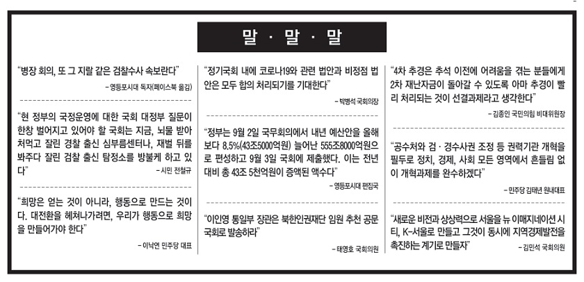 -영등포시대 독자(페이스북 옮김) “현 정부의 국정운영에 대한 국회 대정부 질문이 한창 벌어지고 있어야 할 국회는 지금, 뇌물 받아 처먹고 잘린 경찰 출신 심부름센터나, 재벌 뒤를 봐주다 잘린 검찰 출신 탐정소를 방불케 하고 있다” -시민 전철규 “희망은 얻는 것이 아니라, 행동으로 만드는 것이다. 대전환을 헤쳐나가려면, 우리가 행동으로 희망을 만들어가야 한다” -이낙연 민주당 대표 “정기국회 내에 코로나19와 관련 법안과 비정점 법안은 모두 합의 처리되기를 기대한다” -박병석 국회의장 “4차 추경은 추석 이전에 어려움을 겪는 분들에게 2차 재난자금이 돌아갈 수 있도록 아마 추경이 빨리 처리되는 것이 선결과제라고 생각한다” -김종인 국민의힘 비대위원장 “공수처와 검·경수사권 조정 등 권력기관 개혁을 필두로 정치, 경제, 사회 모든 영역에서 흔들림 없이 개혁과제를 완수하겠다” -민주당 김태년 원내대표 “이제 남은 것은 팩트와 진실을 근거로 사실관계를 그대로 밝히는 일이다. 동부지검이 수사하고 있지만, 저희는 그 수사 결과를 인정할 수 없다” -주호영 국민의힘 원내대표 “새로운 비전과 상상력으로 서울을 뉴 이매지네이션 시티, K-서울로 만들고 그것이 동시에 지역경제발전을 촉진하는 계기로 만들자” -김민석 국회의원 “이인영 통일부 장관은 북한인권재단 임원 추천 공문 국회로 발송하라” 태영호 국회의원 “앞으로도 서울시는 사랑제일교회 등과 같이 방역지침 위반 및 방역방해 행위 등으로 인한 손해에 대해서는 모든 행정력을 동원하여 적극적으로 대응하겠다” 서울시 관계자 “9월 10일부터 매주 목요일 재활용이 가능한 페트병을 별도 수거해 쓰레기 종량제봉투로 교환해주는 사업을 시행한다” -영등포구 “시민의 삶과 직결되는 각종 정책의 최종 결정권을 가진 지방의회는 어떤 경우에도 중단되어서는 안 된다는 절박한 마음으로 서둘러 관련 규정을 마련했다” -김정태 서울시의회 운영위원장