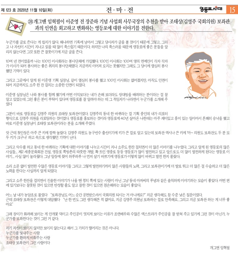 누군가를 글로 쓴다는 게 쉽지가 않다. 왜냐하면 기록에 남아서 그렇고 당사자가 글을 볼 것이기 때문에 그렇고, 그리고 나 자신이 시간이 지나고 읽을 때 많이 쑥스럽기 때문이다. 하지만 나의 쑥스러움 때문에 영등포에 좋은 분들을 알리지 않는다면 그것 또한 큰 잘못이기에 지금 글을 쓴다. 10여 년 전이었을까 나는 100인 이사회라는 봉사단체에 가입했다. 100인 이사회는 100여 명의 연예인이 각자 각자가 이사가 되어 봉사하는 좋은 취지의 봉사단체였다. 지금까지 이어져 오지는 못했지만 그래도 그 당시에 열심히 봉사했던 기억이 있다. 그리고 그곳에서 알게 된 이준영 기획 실장님, 같이 열심히 봉사를 했고 100인 이사회는 없어졌지만, 아직도 인연이 되어 지금까지도 소주 한 잔 걸치는 소중한 인연이 되었다. 이준영 실장님은 나와 봉사를 함께 했기에 어떤 이익보다는 내가 손해 보더라도 상대방을 배려하는 분이라는 걸 잘 알고 있었는데 그런 좋은 분이 부탁이 있다며 영등포를 잘 알려야 하는 데 그 적임자가 나라면서 누군가를 소개해 주었다 그분이 바로 영등포갑 김영주 의원의 조태상 보좌관이었다. 김영주의 동네 한 바퀴라는 걸 기획 중인데 내가 리포터 형식으로 김영주 의원을 리포팅하는 것이었다. 영등포를 홍보하는 것이라 영등포에 40년 살아온 나한테는 아주 재미있고 흥미 있는 일이어서 흔쾌히 승낙을 했고 바로 이준영 실장님이 조태상 보좌관이라는 분을 소개해 주었다. 앗 근데 첫인상은 아주 큰 키에 깜짝 놀랐다. 김영주 의원도 농구선수 출신이기에 키가 큰 걸로 알고 있는데 보좌관 역시나 큰 키에 ‘아~ 의원도 보좌관도 두 분 모두 키가 크구나’하고 속으로 생각했던 기억이 난다. 그리고 악수를 하고 동네 한 바퀴라는 기획에 대한 이야기를 나누고 시간이 지나 소주도 한잔 걸치면서 더 많은 이야기를 나누었다. 그리고 알게 된 영등포의 많은 사실들... 제2 세종문화회관 건설, 영등포 쪽방촌의 따뜻한 개발, 확 트인 영중로 등등 영등포가 많이 발전하고 있고 앞으로도 더 많이 발전하게 된다는 영등포 이야기... 사실 많이 놀라웠다. 그냥 일상에 젖어 하루하루 나 먼저 살기 바쁘기에 영등포가 이렇게 많이 바뀌고 발전 한지 몰랐다. 소리 소문 없이 발전한 수많은 영등포 이야기들 그리고 그렇게 발전하기까지 많은 사람들의 노력, 그리고 보좌관이기에 더 발로 뛰고 더 많은 걸 수습하고 더 많은 노력을 한다는 사실까지 알게 되었다. 그리고 소주 한잔을 걸치면서 진솔한 이야기가 나올 땐 정치 쪽에 있는 사람이 아닌 그냥 동네 아저씨의 푸념과 같은 솔직하게 이야기하는 모습이 좋았다. 어떤 편에 있기보다는 잘못된 것이 있으면 반성할 줄도 알고 잘한 것이 있으면 겸손해하는 모습이 좋았다. 어느 날 내가 농담조로 물었다 “보좌관님도 어느 순간 공천받으셔서 국회의원 되시는 거 아니에요?” 지금 생각해도 참 수준 낮은 질문이었다. 근데 조태상 보좌관은 이렇게 대답했다 “난 한 번도 그런 생각해본 적 없어요, 지금 김영주 의원님 보좌하는 걸로 만족해요, 그리고 지금 보좌관 하는 게 너무 좋아요” 그래 장미가 화려해 보이는 게 안개꽃 덕이고 주인공이 멋지게 보이는 이유가 조연배우와 수많은 엑스트라가 주인공을 잘 받쳐 주고 있기에 그런 것이 아닌가, 누군가를 보좌한다는 것이 그런 거 같다. 자기 자신이 보이지 않지만 보이지 않는다고 해서 그 가치가 떨어지는 것은 아니다. 누군가를 빛내주는 사람 누군가를 환하게 비춰주는 사람 조태상 보좌관이 그런 사람이다.