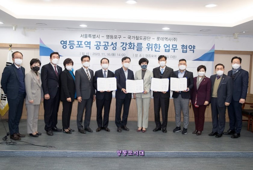 영등포역 공공성 강화를 위한 업무협약이 체결됐다. 11월 16일 오후 서울시와 영등포구, 국가철도 공단 그리고 롯데역사(주)는 영등포역 대회의실에서 영등포역 공공성 강화를 위한 업무협약을 체결했다.