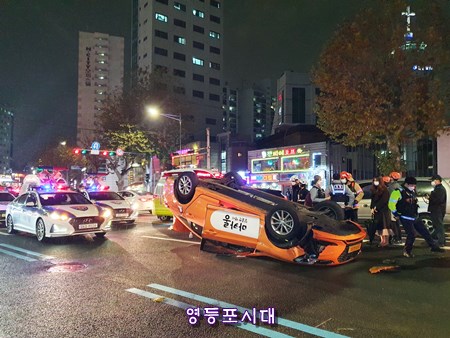 11월 21일 밤 9시 10분경 우리은행 신길동 지점(신길동 삼거리) 앞에서 택시가 뒤집히는 사고가 발생했다.