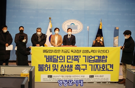 정의당 배진교 국회의원과 민변 민생경제위원회 등은 23일 오전 국회 소통관에서 기자회견을 열고 “온라인 배달앱 시장의 독과점 반대한다”며 “공정위는 배달의 민족 기업결합을 불허하라”고 촉구했다.