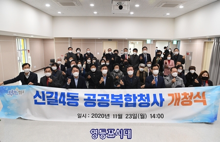 신길4동 주민센터가 총사업비 80억 원이 투입되어, 대지 792㎡, 연면적 2,306.41㎡, 지하 2층~지상 4층 규모의 건물로 재탄생했다. 영등포구(구청장 채현일)는 11월 14~15일 이틀에 걸쳐 신청사로의 이전을 마친 후, 16일부터 본격적인 업무에 돌입한 신길4동 주민센터의 신청사 개청식을 23일 개최했다. 이날 개청식에는 채현일 영등포구청장, 고기판 영등포구의회 의장, 민주당 김민석 국회의원,, 국민의힘 박용찬 당협위원장과 영등포구의회 의원 등 50여 명이 참석해 신길4동 공공복합청사 개청을 축하했다. 1979년 건립된 구(舊) 신길4동 주민센터는 지어진 지 40년이 넘어 지역 내 18개 동주민센터 청사 중 가장 오래된 건물로 손꼽혔다. 신청사는 ▲지하 2층에는 시설유지를 위한 기계실 ▲지하 1층은 주차장 ▲지상 1층에는 동주민센터 업무공간 ▲2층은 주민 편의시설인 마을도서관과 장난감도서관 ▲3층은 구민 체력단련실과 다용도 프로 그램실 ▲4층은 주민 소통공간인 다목적강당과 프로 그램실 ▲옥상은 태양열발전소, 녹지정원으로 꾸며졌다. 신청사는 무(無)장애, 에너지 절약, 친환경’ 건물의 콘셉트로, 휠체어나 보행기를 이용하는 민원인을 배려한 문턱 낮춤, 남녀 별도 장애인전용 화장실 설치 등 장애인과 비장애인 등 모두의 불편함을 최소화했다.