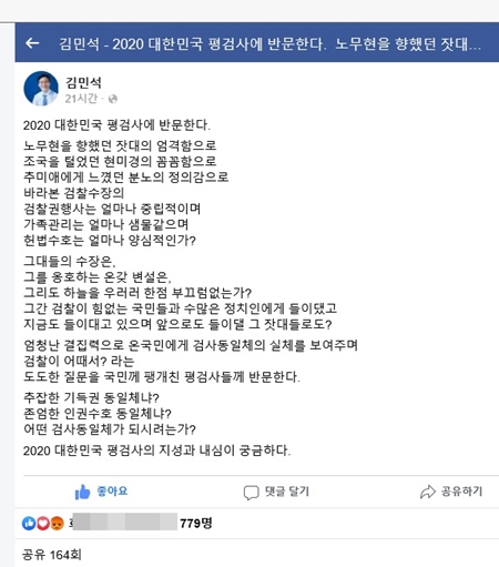 김민석 의원은 “노무현을 향했던 잣대의 엄격함으로, 조국을 털었던 현미경의 꼼꼼함으로, 추미애에게 느꼈던 분노의 정의감으로 바라본 검찰 수장의 검찰권 행사는 얼마나 중립적이냐”며 그동안 이어져 온 검찰의 행태에 대해 비판했다. 김 의원은 이어 “가족 관리는 얼마나 샘물 같으며, 헌법수호는 얼마나 양심적인가?”라며 에둘러 윤석열 총장을 비판하고 평검사들을 향해서도 “그대들의 수장은, 그를 옹호하는 온갖 변설은, 그리도 하늘을 우러러 한 점 부끄럼 없는가?”라고 일침을 가했다. 김민석 의원은 그간 검찰이 힘없는 국민과 수많은 정치인에게 들이댔고 지금도 들이대고 있으며 앞으로도 들이댈 검찰의 잣대에 대해서도 날을 세웠다. 김 의원은 “엄청난 결집력으로 온 국민에게 검사동일체의 실체를 보여주며 검찰이 어때서? 라는 도도한 질문을 국민께 팽개친 평검사들께 반문한다”라며 “추잡한 기득권 동일체냐? 존엄한 인권수호 동일체냐? 어떤 검사동일체가 되시려는가?”라고 묻고 “2020 대한민국 평검사의 지성과 내심이 궁금하다”라는 글로 끝을 맺었다. 김민석 의원의 이글은 780명이 반응을 보였으며 164회가 공유되는 등 SNS(소셜네트워크서비스) 이용자들의 관심을 끌고 있다.