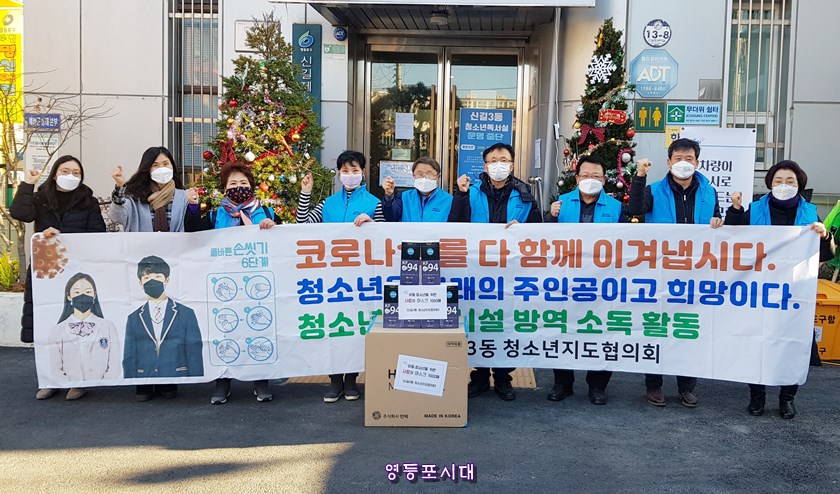 신길3동 청소년지도협의회 김용창 회장과 위원 6명은 12월 8일 오후 3시 영등포구 도림초등학교를 방문해 마스크 1,000장을 전달하고 지역을 돌며 코로나19 예방을 위한 캠페인을 벌였다.