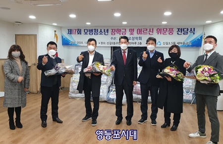 신오장학회 조남형 회장은 12월 22일 신길5동 주민센터 2층 열린마루에서 제17회 ‘2020년 모범 청소년 장학금 및 어르신 위문품 전달식’을 개최하고 신오장학회 고문에게는 표창장, 학생에게는 장학금, 홀몸 어르신들에게는 고급이불을 전달했다. 코로나로 인해 사회적 거리 두기 지침을 준수하면서 최소인원만 참석한 가운데 열린 이 날 행사는 신오장학회 김정우(김영주 국회의원), 김명희•최병춘(김민석 국회의원), 조병대(김인호 서울특별시의회 의장) 고문이 표창장을 받았다.