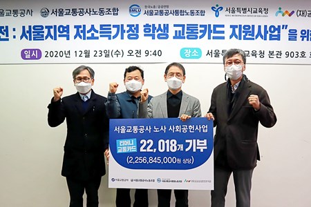 서울교통공사는 공사 내 노동조합(이하 노조) 과 함께 총 22억 5천 6백만 원 상당의 티머니 교통카드를 저소득가정 학생을 대상으로 23일 기부했다. 기부한 교통카드는 총 22,018매로, 카드 1매(개당 2,500원)에 10만 원이 충전되어 있다. 기부금은 본래 사용 예정이었던 직원 복리후생비 17.5억 원과 행사비 5.1억 원, 합계 약 22.6억 원을 공사와 노조가 합의를 거쳐 반납해 마련했다. 공사와 노조는 지하철을 운영하는 공사의 특성을 살릴 수 있는 사회공헌 사업을 논의한 결과, 코로나19로 어려움을 겪고 있는 서울 지역 저소득가정 학생 등 사회적 약자에게 10만 원이 충전된 티머니 교통카드를 지원하기로 뜻을 모았다. 기부된 교통카드는 공공상생연대기금을 통해 저소득가정 학생 교통비 지원에 우선 사용될 예정이다.