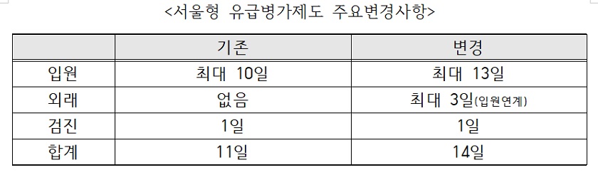 서울형 유급병가 지원일수를 기존 11일에서 14일 확대되고 입원에만 지원되던 서울형 유급병가 지원이 입원과 연계한 외래진료에 대해서도 확대될 전망이다.