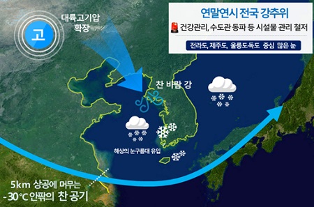 기상청은 “이 기간 동안 전라도·제주도산지·울릉도·독도를 중심으로 많은 눈이 내리겠다”며 “한파와 대설에 대해 철저히 대비할 것”을 당부했다. 기상청은 차가운 대륙고기압이 우리나라로 확장하면서 12월 29일(화) 밤부터 내년 1월 1일까지 강한 한파와 함께 해상에서 만들어지는 눈 구름대의 영향을 받는 전라도·제주도산지·울릉도·독도를 중심으로 많은 눈이 내릴 것으로 전망했다. 29일 밤부터 대륙고기압에 의해 찬 공기가 유입되면서 기온이 낮아지기 시작하고, 12월 30일~1월 1일은 5km 상공에 –30℃ 안팎의 찬 공기가 우리나라에 머물면서 추위의 강도가 강해질 것으로 분석했다. 이후, 1월 2(토)~3일(일)은 찬 공기의 유입 강도가 다소 주춤하겠지만, 4일(월)부터 다시 차가운 대륙고기압이 확장하면서 1월 초순에도 찬 공기가 우리나라에 영향을 줄 것으로 내다봤다. 29일 밤부터 기온이 급격히 낮아지기 시작하여, 30일~1월 1일의 아침 최저기온은 중부내륙이 –15℃ 안팎, 남부내륙이 –7℃ 안팎을 보이면서 전국에 강한 한파가 이어지겠다고 밝혔다. 특히, 30일은 전국의 낮 최고기온이 영하권에 머물고, 31일(목)은 아침 최저기온이 서울 –13℃, 그 밖의 중부내륙은 –20℃ 안팎으로 내려가는 등 이번 겨울 들어 가장 추운 날씨가 나타날 것으로 분석했다. 또한, 이 기간(12. 30.~1. 1.) 동안 “바람도 강하기 때문에 체감온도는 기온보다 5~10℃ 가량 더 낮을 것으로 예상된다”며 “건강관리에 유의가 필요함은 물론 선별진료소 등 야외 업무 종사자는 보온에 각별히 신경 쓸 것”을 권고했다. 1일 오후부터는 찬 공기의 유입 강도가 다소 주춤하면서 일시적으로 추위가 약해지겠지만, 4~5일부터 다시 차가운 대륙고기압이 확장하면서 강추위가 찾아오고, 이후에도 추위가 이어지겠다고 내다봤다. 기상청 예보관은 “추위가 장기간 지속될 것으로 예상되는 만큼 철저한 건강관리와 함께 수도관 동파 등 시설물 관리와 비닐하우스 농작물의 냉해 피해에 대한 유의도 필요하다”고 당부했다. 30일~1월 1일에 매우 찬 공기가 서해상과 동해상을 지나면서 눈 구름대가 발달하고, 이 눈 구름대가 유입되는 충남과 전라도, 제주도, 울릉도·독도에 눈이 내릴 것으로 분석했다. 특히, 찬 공기가 유입되는 기간이 길어지면서 눈 구름대가 지속적으로 발달하기 때문에 충남서해안과 전라도, 제주도, 울릉도·독도는 대설특보가 발표될 가능성이 높겠다고 밝히면서, 비닐하우스 붕괴 등의 시설물 피해가 발생하지 않도록 대비하고, 강한 바람까지 더해지면서 항공편이 결항될 가능성도 있으니 이용객들이 사전에 운항정보를 확인할 것을 권고했다. 또한, 29일 전국에 비/눈이 내린 후 기온이 급격히 내려가고 이후에도 추위가 장기간 이어지면서 쌓인 눈이 녹지 않거나 비가 얼어붙어 빙판길이 되는 곳이 많겠다며 보행자와 차량의 안전사고에도 각별히 유의해야 한다고 전했다. 기상청 예보관은 “다음 주에 찬 공기가 유입되는 강도가 다시 강해지면서 해상에 눈 구름대가 발달하고, 이 눈 구름대가 유입되는 전라도, 제주도, 울릉도·독도를 중심으로 5일부터 다시 많은 눈이 내릴 가능성이 있으므로 지속적으로 기상정보에 관심을 기울여 달라”고 덧붙였다.