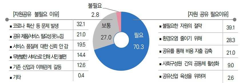 불필요한 자원 절약 차원, 환경오염감소... 서울시민 70.3%는 코로나19의 확산으로 ‘공유활동’에 대한 우려가 있음에도 불구하고 자원공유가 ‘필요’하다고 생각하는 것으로 나타났다.