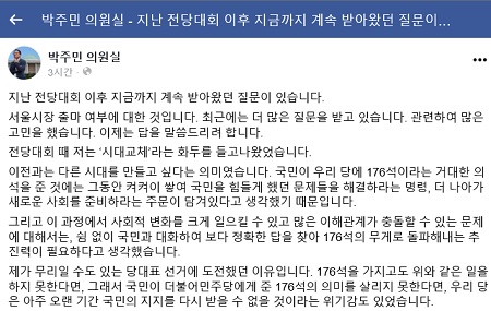 박주민 의원은 1월 19일 오전 페이스북에 “지난 전당대회 이후 지금까지 계속 받아왔던 질문이 있습니다”로 시작한 장문을 통해 “더 길고 담대하게 바라보면서 나아가고자 한다. 그래서 이번 서울시장 보궐선거에 출마하지 않는 것으로 결정했다”라고 밝혔다. 박주민 의원은 “5년이란 짧은 기간 정치를 하면서 늘 어떤 자리에 있느냐보다는 무슨 일을 해야 하고 할 수 있는지에 집중해 왔다”라며 이같이 밝혔다. 박 의원은 “그런데도 이번 보궐선거의 승리가 얼마나 중요한지 누구보다도 잘 알고 있다”며 “비록 출마하진 않지만, 후보처럼 승리를 위해 최선을 다했다”라고 강조했다. 박주민 끝으로 자신에게 출마를 권했던 분들께 감사와 미안한 마음을 전하고 “대한민국의 시대교체와 위기 속에서도 ‘잊혀진 사람’ 없는 나라다운 나라를 만드는데, 어디서든 역할을 다하겠다”고 적었다. 이로써 4월 치러지는 서울시장 보궐선거 민주당 후보는 박영선 장관과 우상호 의원 중 한 사람이 될 것으로 보인다. 다만 외부인사 영입론이 완전히 사라지지 않은 것이 변수다.