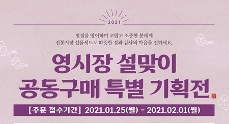 코로나19의 재확산과 사회적 거리두기 연장조치에 따라 침체한 전통시장을 살리기 위한 일환의 하나다. 영등포구는 이번 공동구매를 통해 ▲참기름, 건어물, 김 세트(영등포전통시장), ▲한과, 강정 세트(우리 시장), ▲양말, 내의 세트, 홍삼(영신상가), ▲곶감, 화장품(대림 중앙시장) 등의 설 제사용품과 품질 좋은 우리 농산물을 합리적인 가격에 구매할 수 있다. 공동구매 주문은 2월 1일까지 진행하며, 핸드폰 카메라 또는 네이버 앱을 활용해 QR코드를 입력, 네이버 스마트 스토어에 접속하면 된다. 공동구매 선물세트는 2월 4일부터 순차적으로 배송되며, 택배비는 전액 무료이다. 또한 현장에서 물건을 직접 보고 구매가 가능한 팝업스토어도 선보일 예정이다. 팝업스토어는 ▲1월 26일부터 27일까지 오후 3시부터 7시 영등포시장역과 ▲1월 28일부터 29일 오후 4시부터 8시까지 영등포구청역에서 진행된다. 아울러, 네이버 스마트스토어를 통해 구매한 경우, 추첨을 통해 1만 원 상당의 모바일 온누리상품권, 현장 판매 행사에서 2만 원 이상 구매 시, 5천 원 상당의 지류 온누리상품권 선착순 증정 이벤트도 마련된다. 구는 관내 전통시장 상인들과 유기적인 협업을 통해 ‘영시장’이라는 공동브랜드를 개발, 전통시장이 지닌 차별화된 특색과 다양한 우수상품을 선보이며 전통시장 매출 증대와 골목상권 활성화에 힘쓰고 있다. 또한 구는 관내 18개 동주민센터에 판매상품을 전시하여, 지역주민들이 직접 상품을 확인하고 구매할 수 있도록 편의를 제공한다.