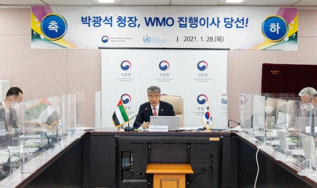 기상청(청장 박광석)은 1월 28일(목), 세계기상기구(WMO) 집행이사 보궐선거에서 아시아지역 회원국으로부터 만장일치로 박광석 기상청장이 집행 이사로 당선되었다고 밝혔다. 박광석 기상청장이 집행 이사로 선출됨에 따라, 우리나라는 2007년부터 집행이사국의 지위를 유지하게 되었으며, 2023년까지 임기를 수행하게 된다. 이번 집행 이사 당선은 그동안 우리나라가 기상·기후 분야 기술공여국으로서, 국제사회에 대한 우리나라의 위상과 신뢰가 높아진 결과로 평가된다. 세계기상기구(WMO) 아시아지역협의회 의장은 우리나라가 집행이사 보궐선거에서 회원국의 만장일치로 선출된 점을 높이 평가했다. 박광석 기상청장은 1월 28일(목), 집행 이사 당선을 계기로 세계기상기구 아시아지역협의회 의장(아랍에미리트(UAE) 기상청장)과 협력을 위한 첫 화상회의를 가졌다. 의장은 “2019년 세계기상기구 조직개편 이후 기후변화대응 지역 내 프로그램 강화, 회원국 역량개발 등의 분야에서 한국의 주도적인 역할을 기대한다”고 밝혔다. 이에, 박 청장은 “공적개발 원조 프로젝트와 세계기상기구 한국지역훈련센터(RTC-Korea) 훈련프로그램을 통해 선진국과 개도국 간의 기상기술 격차를 줄이는데 기여하는 등 집행 이사로서의 역할을 다하겠다”고 화답했다. 특히, 양국 기상청장은 기상 분야에서도 양국 간 인공강우 기술발전을 위해 인공강우 실험 결과를 공유하고 전문가 교류를 추진하는 등 기술 협력 강화의 필요성에 공감하였다. 박광석 기상청장은 “세계기상기구 집행이사 진출은 그린뉴딜 추진과 2050 탄소 중립선언 등 기후변화 대응을 위한 우리나라의 노력이 국제적으로 높이 평가되고 있음을 보여주는 결과라고 생각합니다.”라며, “세계기상기구 집행 이사로서 국제사회의 기후위기 대응은 물론, 국내적으로도 기후탄력사회를 위한 노력을 강화해 나가겠습니다.”라고 밝혔다.
