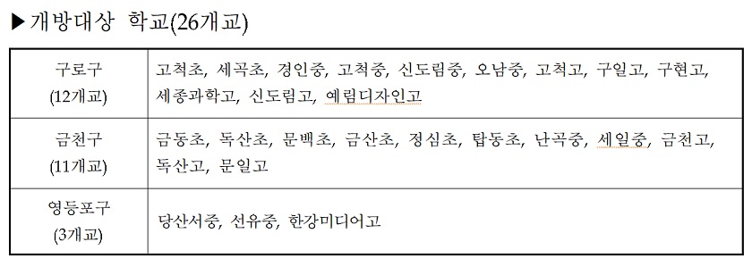 영등포구, 구로구, 금천구에 있는 공•사립 초•중고 26개교(영등포구 3개교, 구로구 12개교, 금천구 11개교)가 자율적인 참여로 설 연휴 기간인 2월 11일부터 2월 14일까지 4일간 주차시설을 무료로 개방한다. 서울 교육청은 올해 설 연휴 기간에도 지역주민과 역(逆)귀성객의 주차 편의를 위하여 지역 내 학교 운동장과 주차장을 무료로 개방한다고 2월 4일 오전 밝혔다.