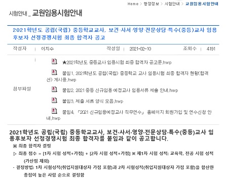 서울특별시교육청은 2월 10일 오전 ‘2021학년도 공립(국립) 중등학교 교사, 보건·사서·영양·전문 상담, 특수(중등)교사 임용시험 최종 합격자’ 28개 과목, 총 689명을 서울시교육청 누리집을 통해 발표했다.