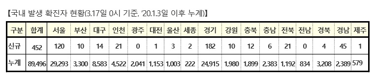질병관리청 중앙방역대책본부(본부장 정은경 청장)는 3월 17일 0시 기준으로, 코로나바이러스감염증-19 국내 발생 신규 확진자는 452명, 해외유입 사례는 17명이 확인되어 총 누적 확진자 수는 96,849명(해외유입 7,353명)이라고 밝혔다. 의심 신고 검사자 수는 45,433명, 수도권 임시선별검사소 검사 건수는 28,802건(확진자 62명)으로 총 검사 건수는 74,235건, 신규 확진자는 총 469명이다. 신규 격리해제자는 559명으로 총 88,814명(91.70%)이 격리 해제되어, 현재 6,349명이 격리 중이다. 위 중증 환자는 100명, 사망자는 8명으로 누적 사망자는 1,686명(치명률 1.74%)이다.