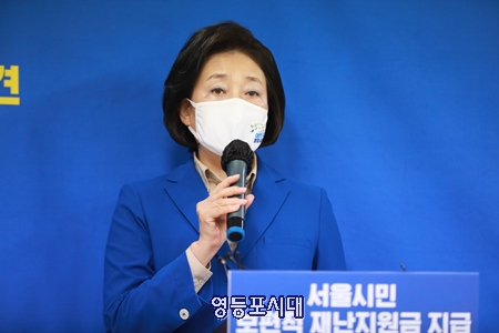 박영선 민주당 서울시장 후보가 19일 오전 안국빌딩 캠프에서 기자회견을 열고 “서울시장이 되면 서울시민 모두에게 1인당 10만 원의 보편적 재난위로금을 블록체인 기반 KS서울디지털화폐로 지급하겠다”고 약속했다.