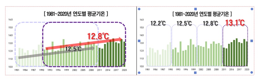 전국 평균 기온 12.8℃로 이전 평년값보다 0.3℃ 증가 기후평년값은 세계기상기구(WMO)의 기준에 따라 10년 주기로 산출되는 기후의 기준값으로, 이제까지는 2011년에 발표한 1981년부터 2010년의 기후평년값(이전 평년)이 사용되어 왔다.
