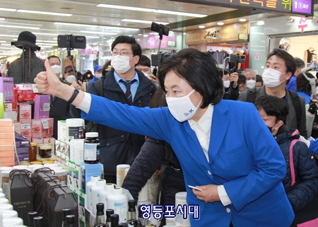 더불어민주당 박영선 서울시장 후보가 25일 오후 4시 영등포 지하상가를 돌며 유세를 펼쳤다. 박영선 후보는 지하상가 상점을 일일이 들려 명함을 주며 지지를 호소했다.