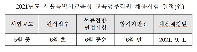 채용시험공고, 서울시교육청에서 일괄 주관 공고 2021년 9월 1일 자 채용 예정인 ‘2021년도 제2회 서울시교육청 신규 교육공무직원 채용시험’은 예년보다 2개월 더 앞당겨 시행된다.
