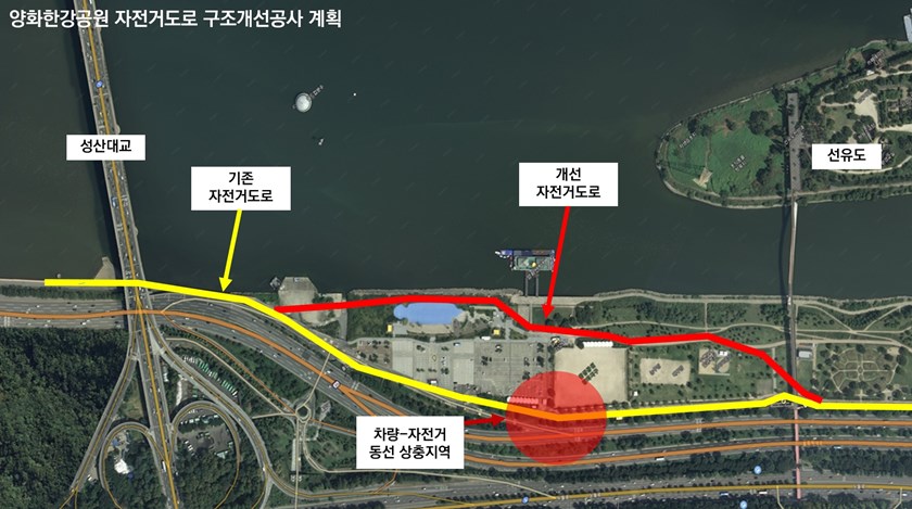 천만 시민의 휴식 공간인 한강공원에서 보행자와 자전거도로 이용자 모두가 즐거운 보행환경을 만들기 위해 이번에 진행되는 양화한강공원 자전거도로 구조개선 공사는 성산대교 남단에서 선유교까지의 구간이다.